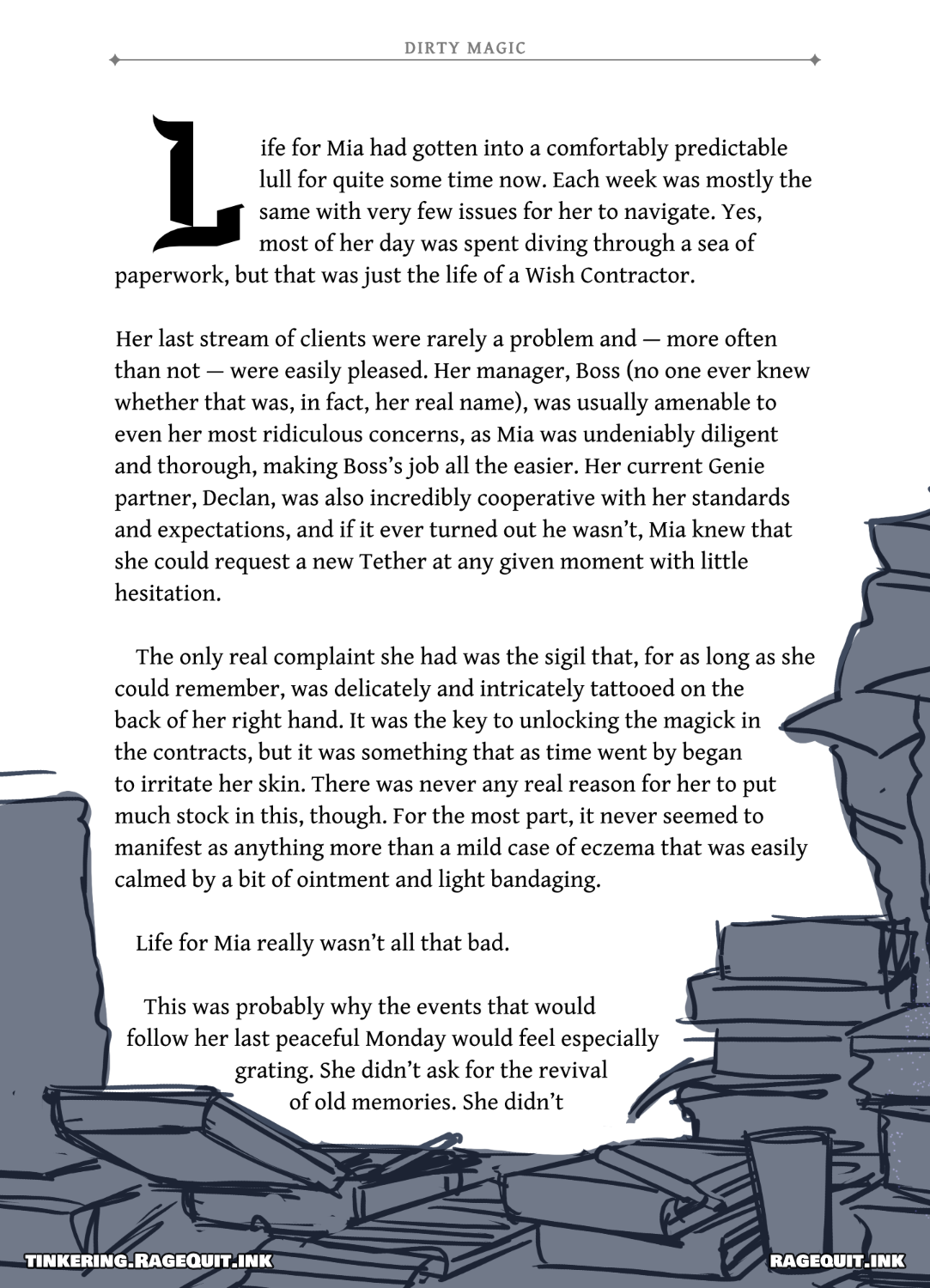 It turns out that Dre forgot that she had started adding illustrations to the Novella version of Dirty Magic and we’re working together to figure out how to get it completed. The illustrations won’t be finalized but they will be in a clean enough state to give you an idea of what’s happening and to add more depth to the story. You can check out a preview of the first two pages here: